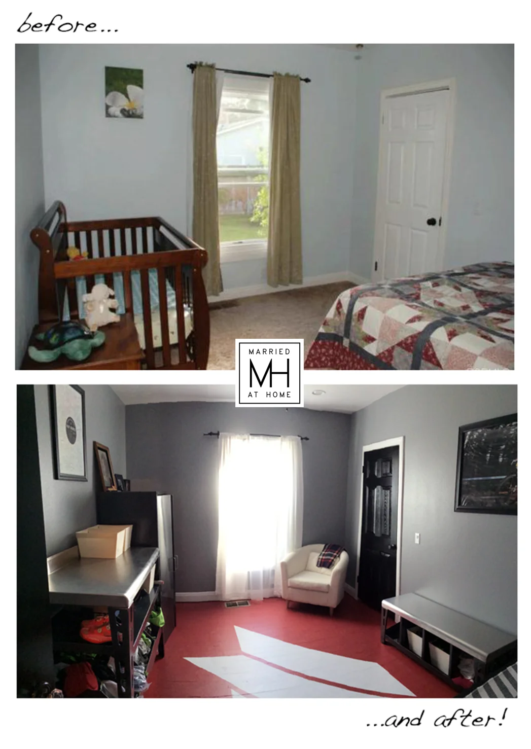 With custom-made stainless furniture to store his gear, Johnny had already gone a long way toward making the room his own. But our recent discovery of original hardwood floors underneath the carpet in two of our downstairs bedrooms, and ultimately our decision to paint the floors red, brought the mancave to an entirely new level of awesome.
